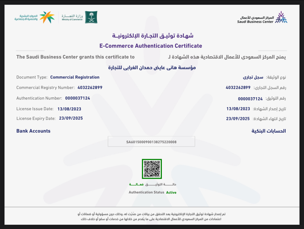 مرفق ادناه شهادة توثيق المتجر الإلكتروني